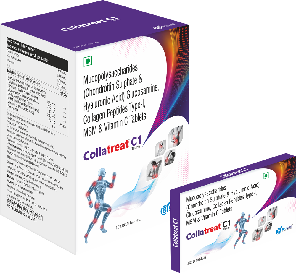 Mucopolysaccharides (Chondroitin Sulphate 200 mg & Hyaluronic Acid 25 mg) + Glucosamine Sulphate 2KCL 750 mg + Collagen Peptides Type-I 40 mg + MSM 250 mg & Vitamin C 25 mg. TABLETS