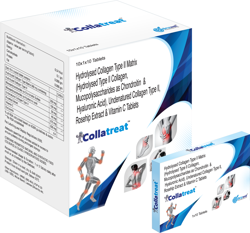 Hydrolyzed Collagen Type II Matrix 500 mg containing Hydrolyzed Collagen Type II 350 mg + Mucopolysaccharides as Chondroitin Sulfate 100 mg + Mucopolysaccharides as Hyaluronic acid 50 mg + Undenatured Collagen Type II 40 mg + Rosehip Extract 375 mg + Vitamin C 200 mg TABLETS